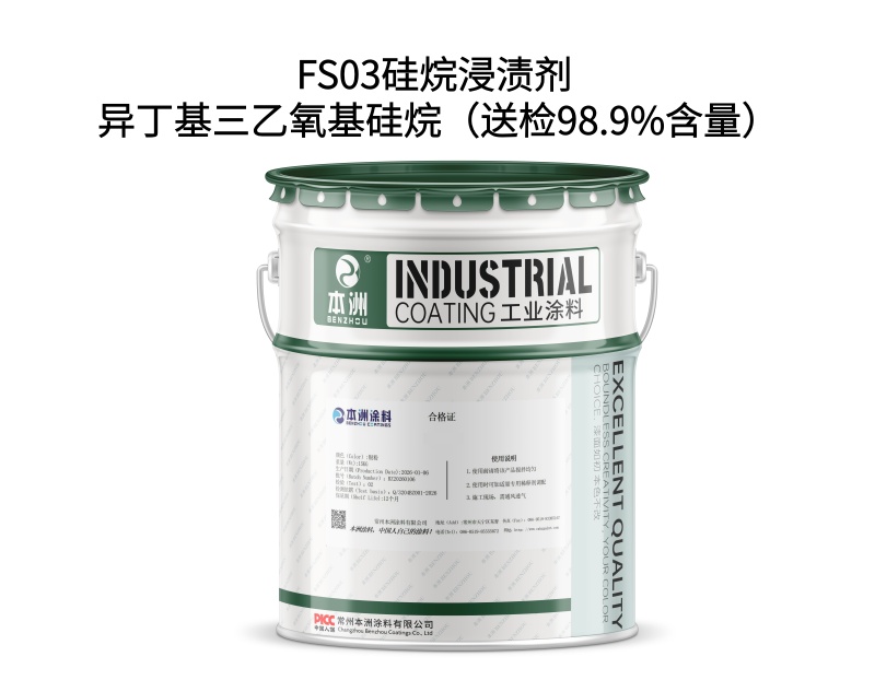 异丁基三乙氧基硅烷(送检含量98.9%)是高纯度单组分硅烷单体,作为FS03硅烷浸渍剂的核心原料,可直接用于混凝土结构的深度防护,其高纯度特性确保了优异的渗透和憎水效果。